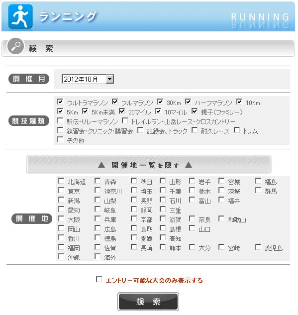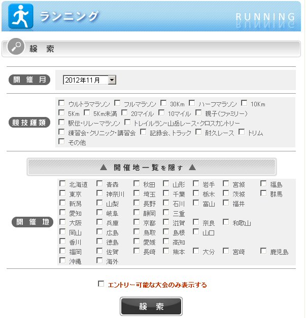 私がWEBアプリケーションを構築したりするからだけじゃないと思いますが、スポーツエントリーのホームページで大会の検索をしているとき前々からいつも思うことがある。